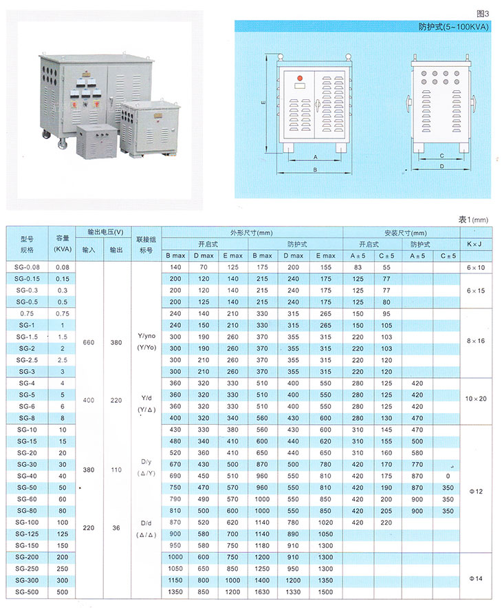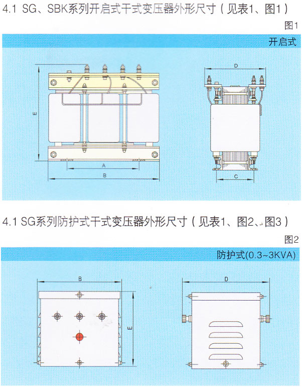 SG、SBK系列三相干式變壓器可制成開啟式或防護(hù)式,具有損耗低、噪聲小、防火性能好和不污染環(huán)境等優(yōu)點(diǎn):其中防護(hù)式是采用鋼板加工成箱殼,變壓器在箱殼內(nèi)部,箱殼外有進(jìn)出線孔,以便安裝電源線路。另外,防護(hù)式可按用戶要求增加電壓電流監(jiān)控儀表,80kVA以上大容量的還可增加軸流散熱風(fēng)機(jī),也可增加轉(zhuǎn)向輪以便移動(dòng)。